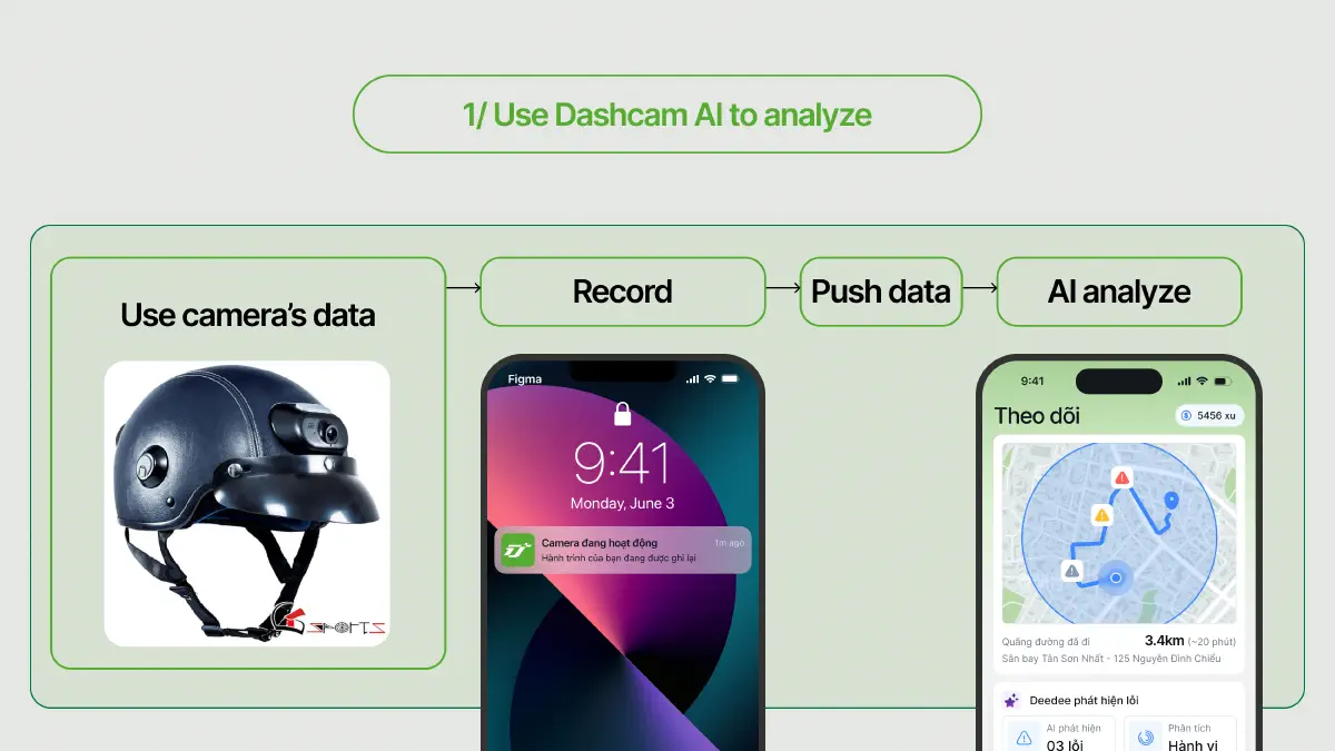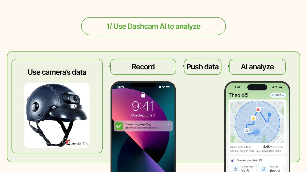 Before heading out, the users only have to wear a specialized motorcycle helmet that’s equipped a small camera. The camera is configured to automatically record and send data with wi-fi signals to Dede mobile app. When the user finished their journey and their phone is connected to Internet, Dede push those data to AI so the AI can analyze the user’s journey and produce the analysis after an amount of time.