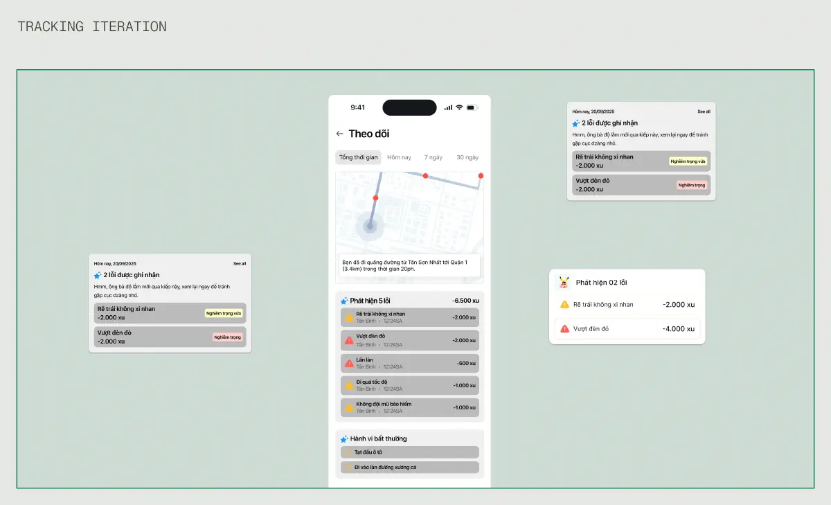 Since tracking and reporting mistakes when driving or riding on the road is our most prominent feature, we dived in it first to quickly explore potential key functions which could be highlighted. These included a tracking map for the user’s road journey, detailed reports based on the severity of the mistakes were made, as well as some short light-hearted punish sentence.