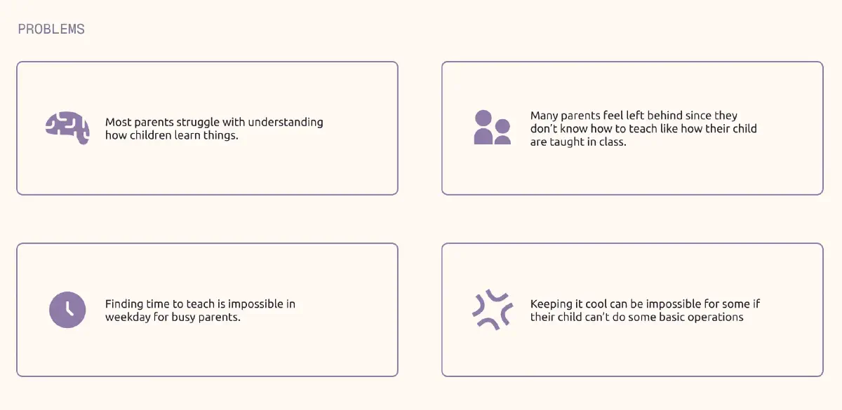 We wanted to gain a better understanding of how parents navigate teaching Math to their kids. After some rounds of conducting desk research and interviewing parents, we identified a few common patterns: