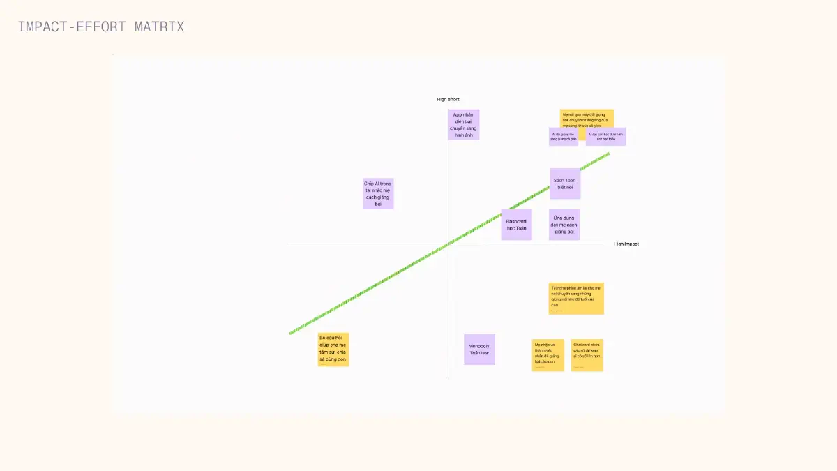 We hosted a small brainstorm with our recruited peers who’s interested in education or have knowledge in teaching children. After that, we began to vote the feature which had the most “likes” and analyse their effort and impact on users with impact - effort metrix.